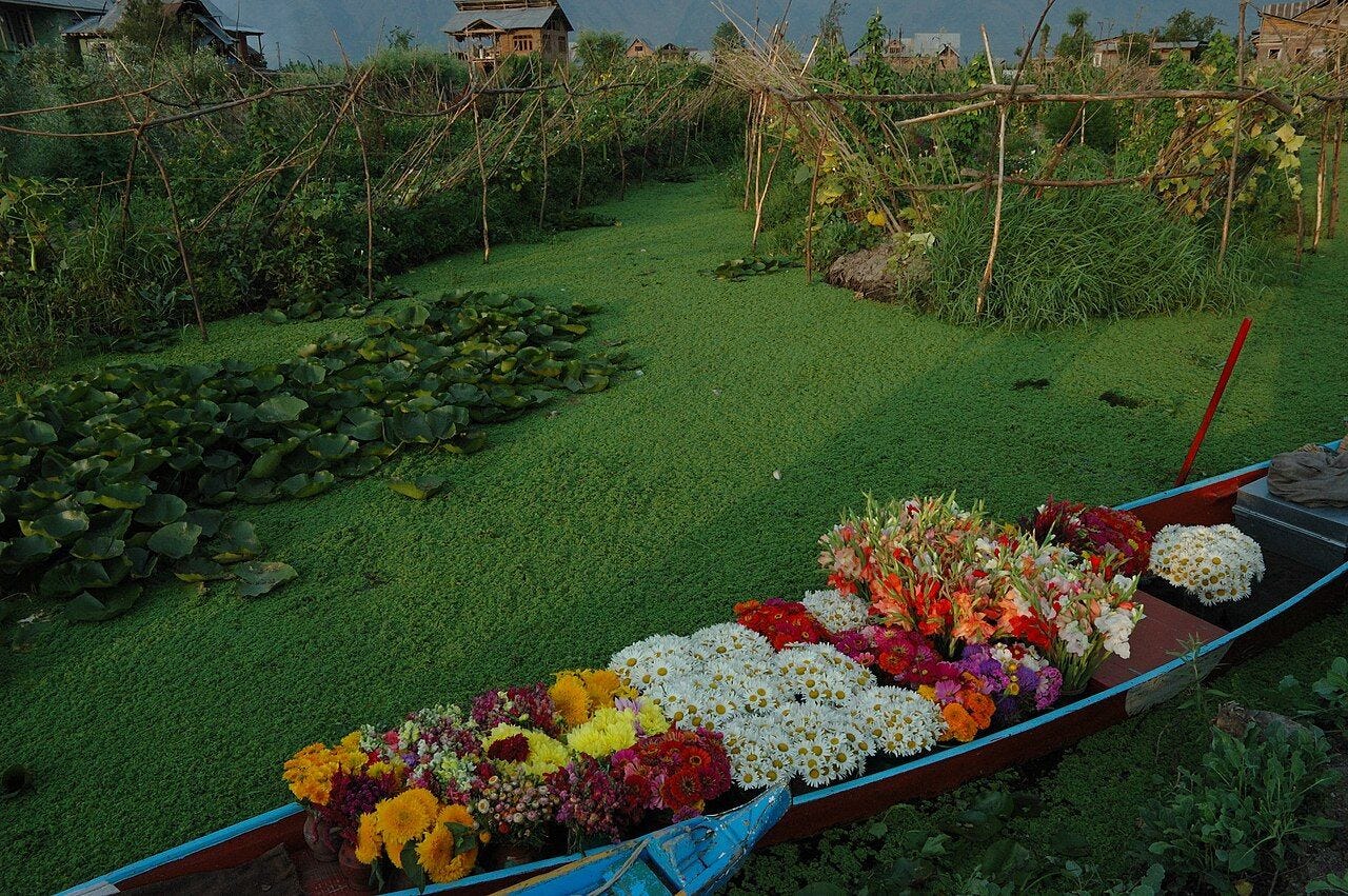 Not far from these ancient ruins, another world floats quietly over the water. Dal Lake, near Srinagar in Indian-controlled Kashmir, is one of Asia’s largest freshwater lakes. Dal Lake in Srinagar, Kashmir, is renowned for its floating gardens, locally known as Rad. These gardens are constructed on reed mats made from aquatic plants like Typha angustata and Phragmites australis, layered with mud and organic matter.