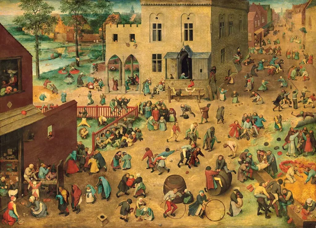 On a lighter note, Children’s Games provides an insightful look into 16th-century childhood. Bruegel fills the canvas with over 200 children engaging in various activities, from rolling hoops to playing leapfrog. It’s a lively and chaotic scene that showcases his keen observation of human behavior, while also subtly reflecting on the fleeting nature of childhood innocence.