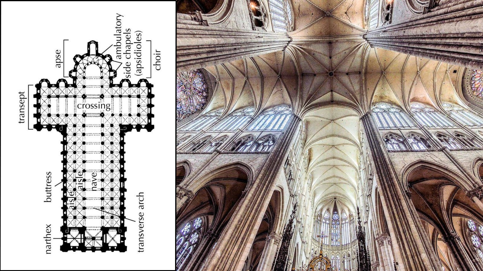 So, medieval architects applied the structure found in the human body to the structural elements: nave, dome, transepts, crypts, vaults.