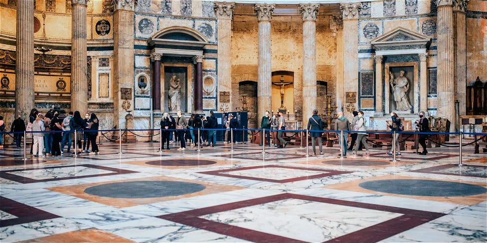Pantheon floor showing a couple standing on a marble floor tile which shows how large and beautiful the marble tiles are