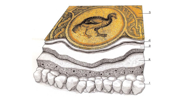 Graphic reproduction of mosaic stratigraphy: 1 – Statumen - First preparatory layer which is made of large stones laid on the ground, previously leveled and rammed. This layer only exists if the mosaic has been constructed on a natural soil. 2 – Rudus - Second preparatory layer which is spread over the statumen. This layer is made of a lime mortar with large aggregates. 3 – Nucleus - Third preparatory layer which is spread over the rudus in a thinner layer. The nucleus is made of a mortar with fine aggregates. 4 – Bedding layer - Fourth preparatory layer of mortar which is very rich in lime, and thinly applied in small sections over the nucleus. Tesserae are inserted in this layer before the mortar sets. 5 – Tessellatum - Layer which constitutes the mosaic surface and is composed of tesserae and mortar filling the interstices between them. Photo credits: Vincenzo Starinieri Study of Materials and Technology of Ancient Floor Mosaics Substrate.