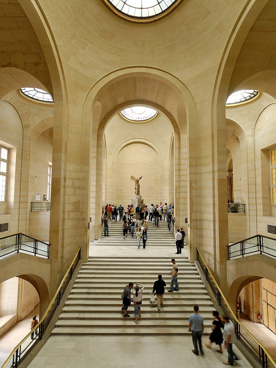 She has no head, no arms, and parts of her wings are gone. Even so, she does not feel ruined. She feels unstoppable. At the top of the Louvre’s Daru staircase, she still seems to have landed only a moment ago, her chest thrust forward, her wings straining behind her, her robes whipped by a wind that never stopped blowing. The marble looks less like stone than cloth pinned to flesh by weather. That is why the sculpture still hits with such force. It does not just stand there; it arrives.