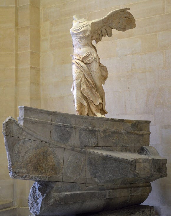 The strangest thing about the Nike of Samothrace is that it feels more alive because it is broken.