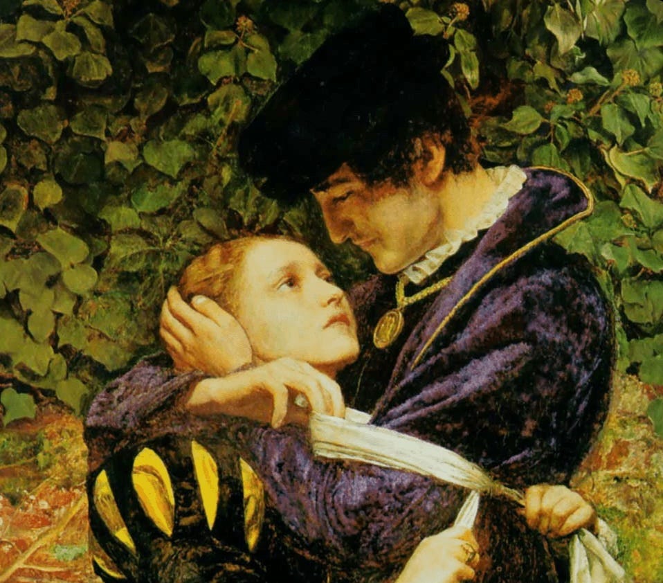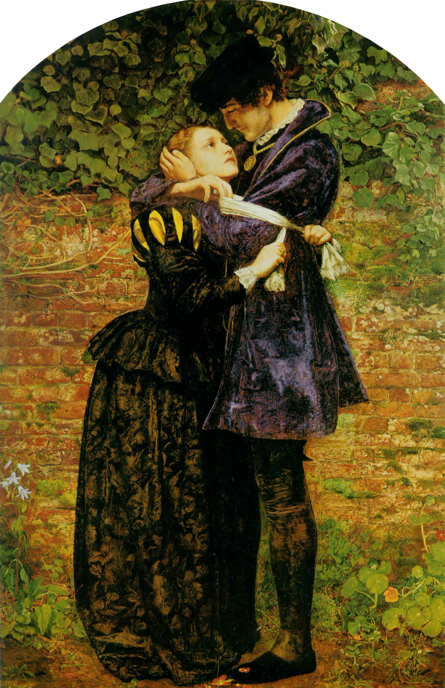 John Everett Millais created “A Huguenot on St. Bartholomew’s Day” in 1852 at the height of the Pre-Raphaelite period. This lesser-known work depicts a pair of young lovers, Valentine and Raoul, with their bodies wrapped in an embrace and eyes locked in an intense gaze, framed against a brick wall as if hiding from the world.