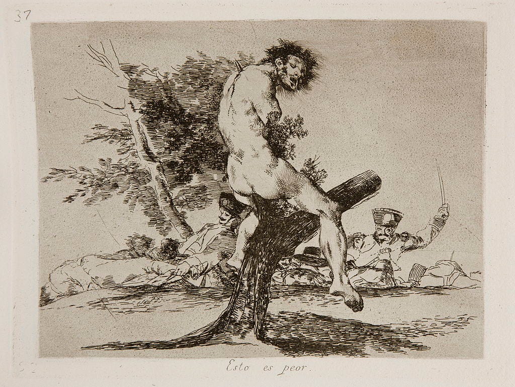 And he didn’t stop. Goya created The Disasters of War, a series of etchings that plunge deeper into human cruelty. One of the most infamous is titled This is worse. It shows a mutilated corpse hanging from a tree, limbs hacked off, horror frozen in his eyes. There’s no caption explaining the context. Goya lets the image speak—and it screams.