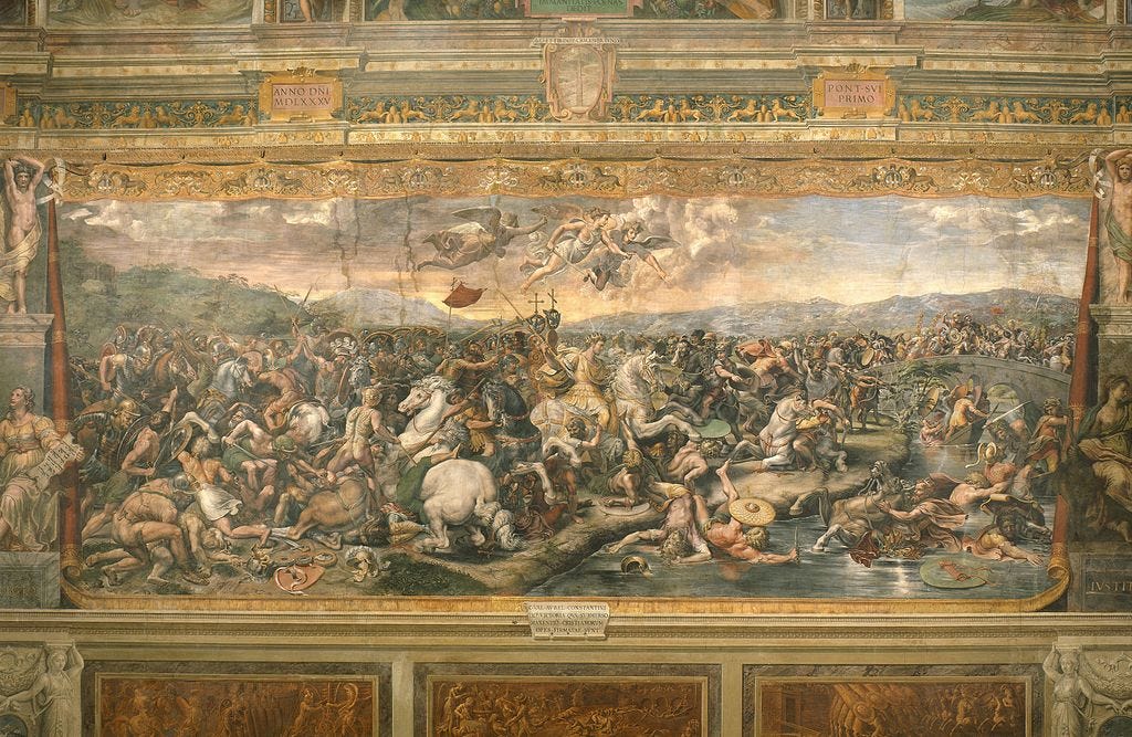 Twelfth is the Battle of Milvian Bridge in Raphael’s rooms. It’s spectacle with a point: victory under the sign of the cross. White horse for Constantine, a panic of bodies and splashes for the defeated. History made legible in one glance.