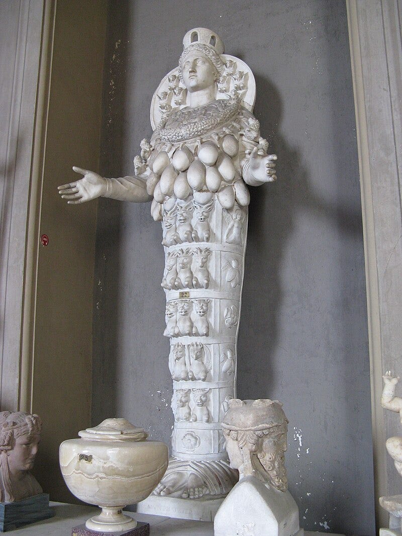 Twenty-eighth is the Artemis of Ephesus in the Candelabra Gallery. People call them many-breasted at a glance. They’re bull testicles, fertility as a blunt symbol. It’s Roman copying of an Asian cult image, and the shock has not aged.